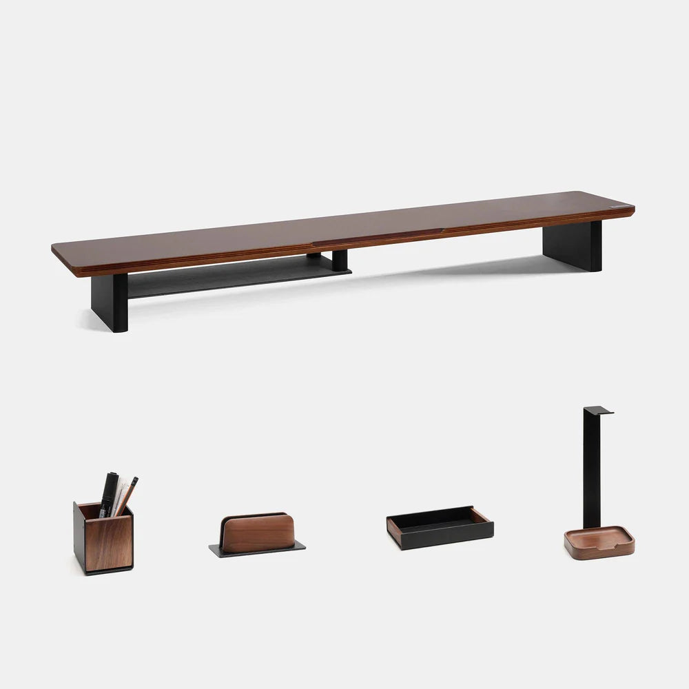 This desk shelf, finished in a stunning black walnut color, is the perfect blend of wood and aluminum, showcasing a timeless design that’s both durable and beautiful. Its sleek and minimalistic style adds sophistication to any workspace.