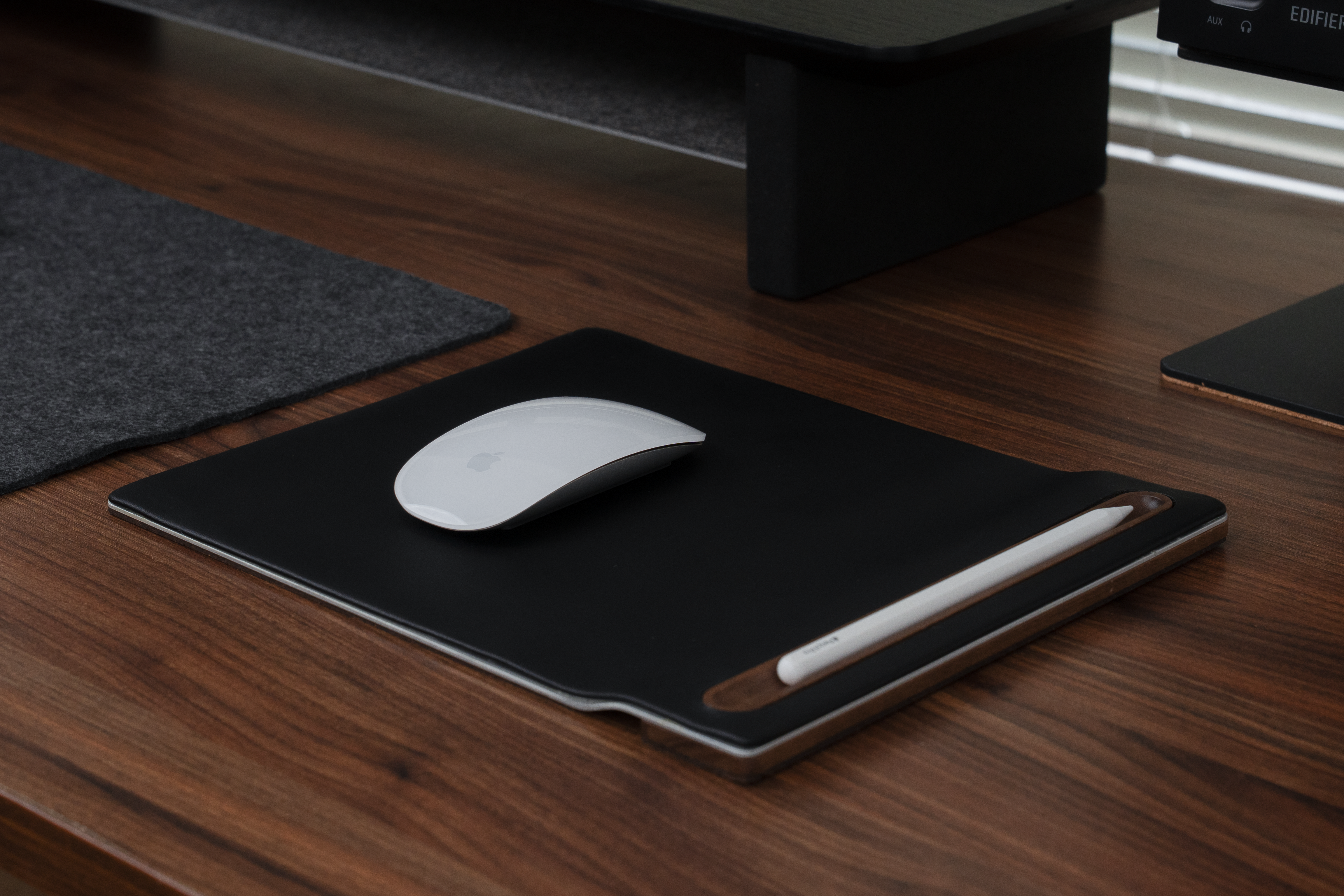 The Mouse Pad v2.0 combines vegetable-tanned leather, hand-sanded walnut wood, and aluminum for a durable yet luxurious feel. Its soft cork base ensures comfort and stability, while an optional hardwood pen tray keeps essentials within reach.