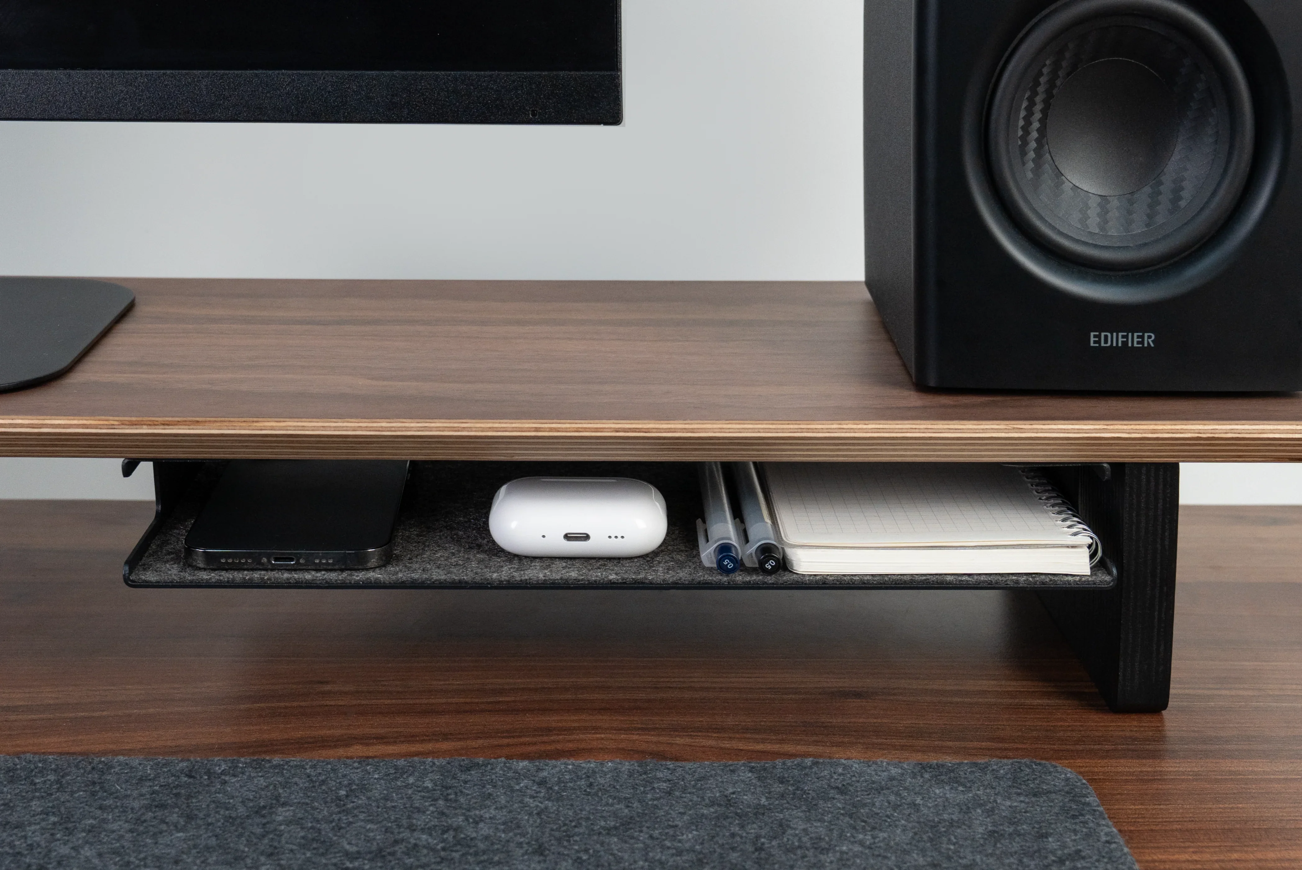 We designed the Desk Shelf Tray after realizing how often small essentials clutter the desk. This add-on feels invisible until you need it — sliding neatly beneath your shelf, keeping everything tidy yet instantly accessible.